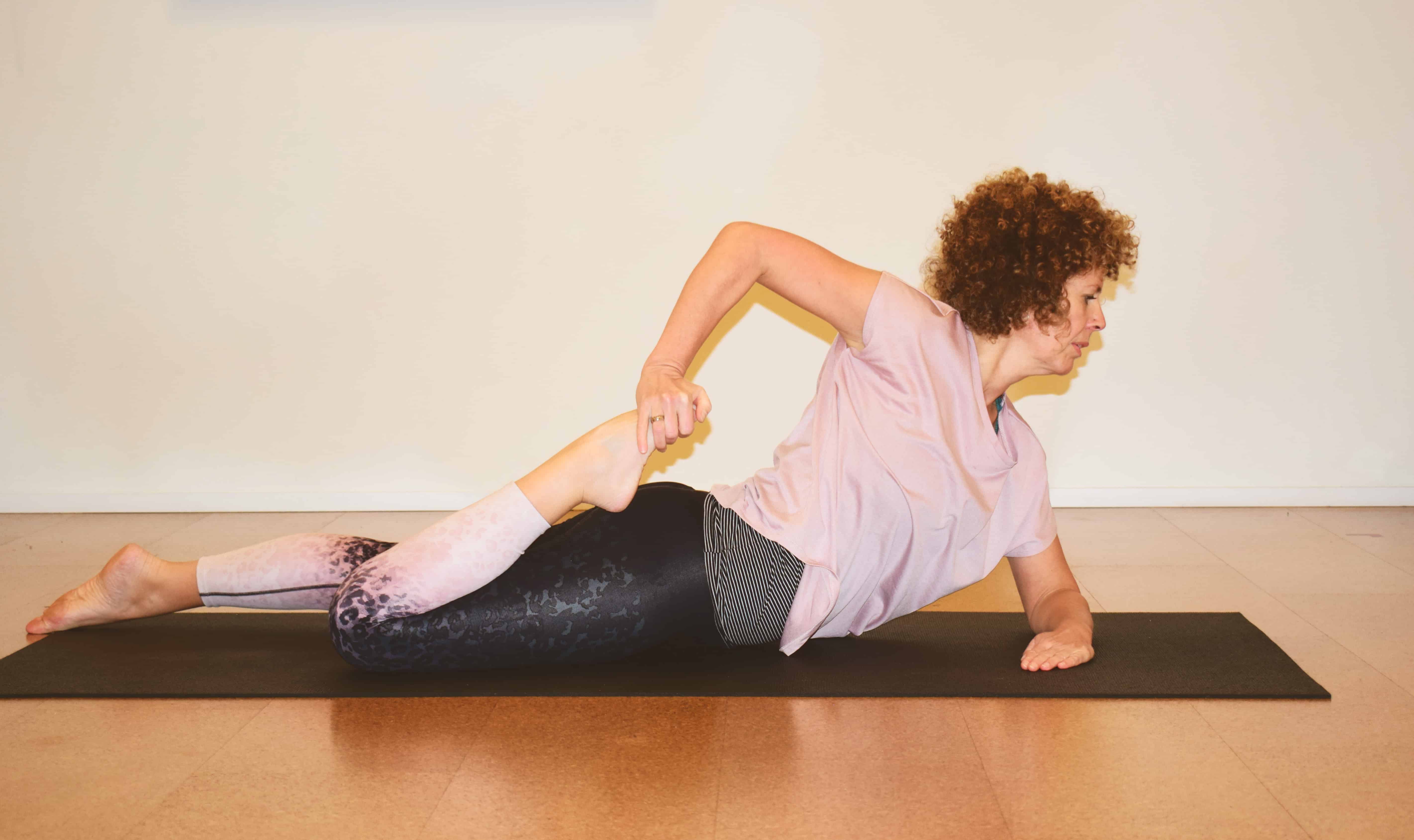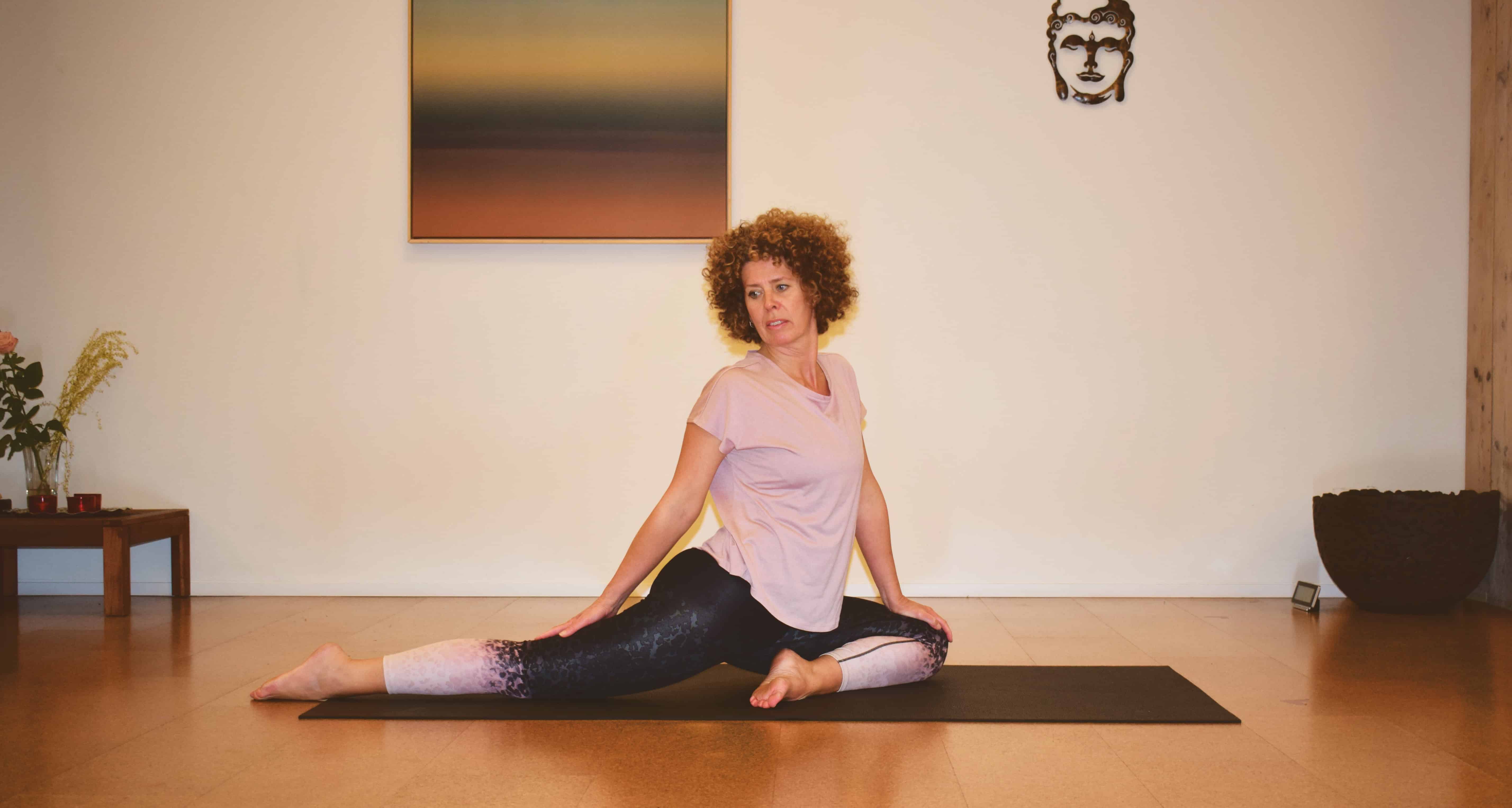 Deze houding opent niet alleen de heup, maar werkt ook op de diepere weefsels. Adem diep in en laat de emoties los op de uitademing.